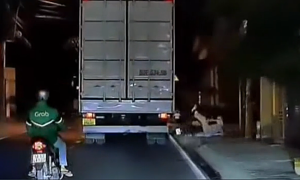 Thanh niên đi xe máy ngã lăn vì cố vượt xe tải