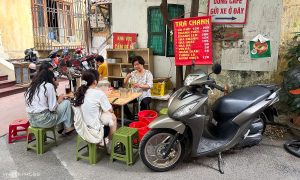 Một tay thoăn thoắt pha trà chanh, tay kia chỉ vào chiếc Honda Vision chưa một vết xước mà bà
