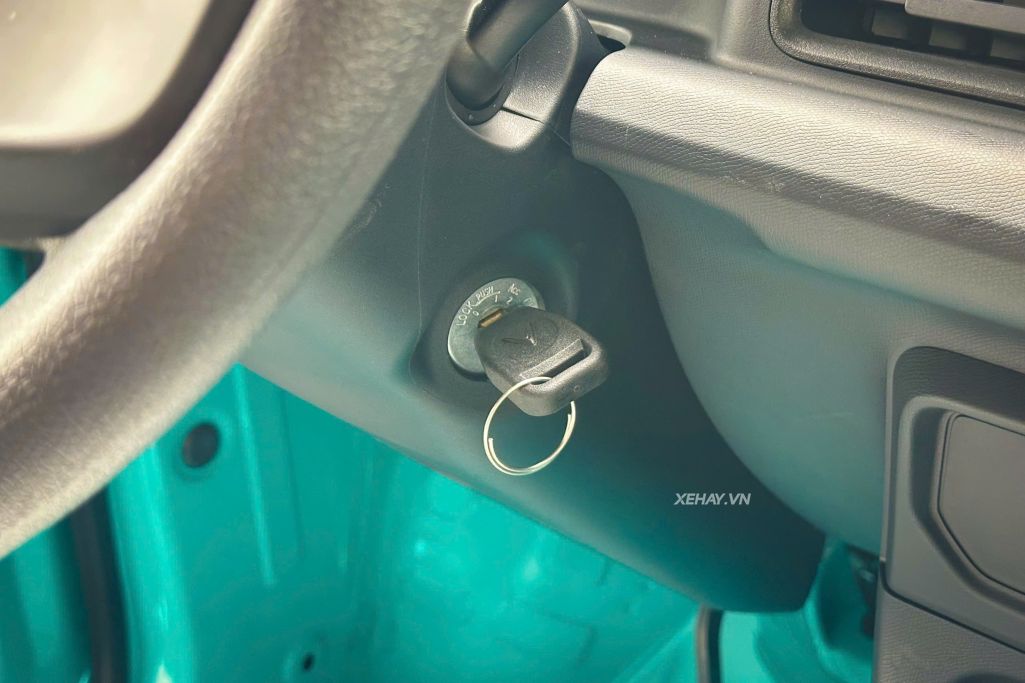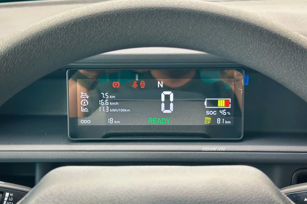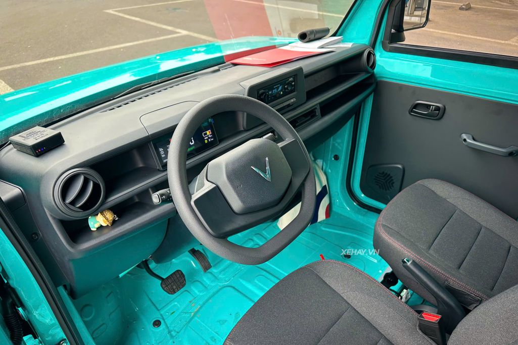 Khác với hình ảnh mô phỏng, cửa xe không còn tay quay hạ kính mà chuyển sang loại chỉnh điện, vận hành qua cụm nút gạt đặt dưới vị trí đầu radio. Vô-lăng mang phong cách của VF 3 và đi kèm cần chuyển số đặt phía sau. Cụm màn hình nhỏ hiển thị những thông tin cơ bản như dung lượng pin, tốc độ, mức điện tiêu thụ và quãng đường.