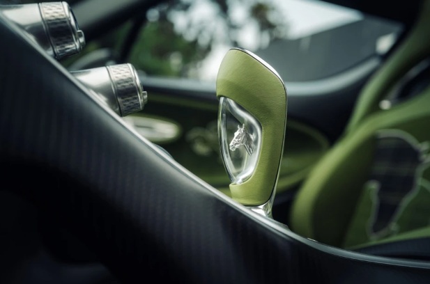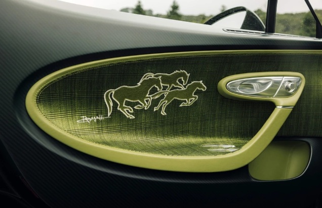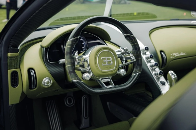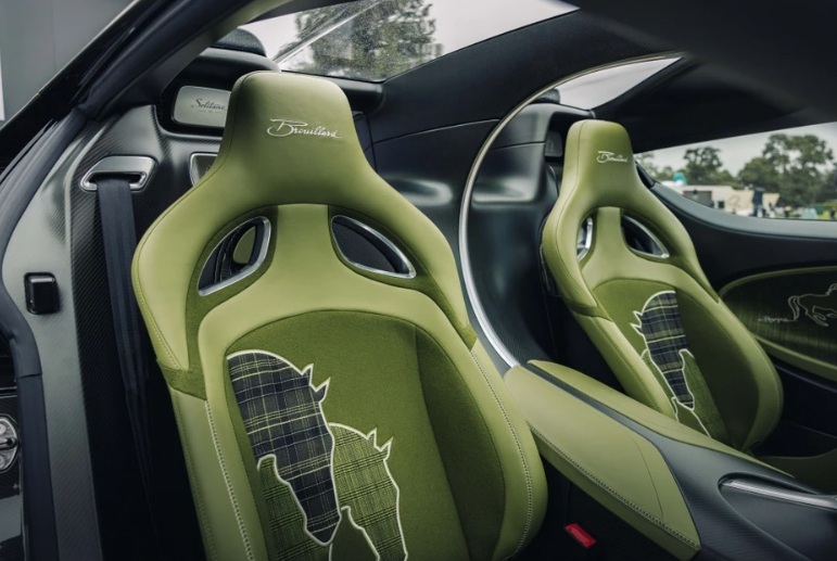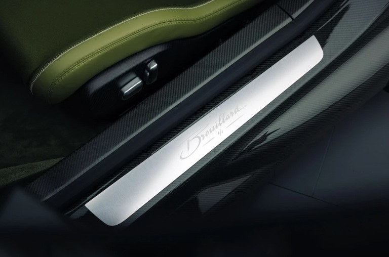 Bên trong khoang cabin của xe là sự kết hợp của vải dệt tartan từ Paris với sợi carbon xanh lá độc bản, vừa sang trọng vừa cá tính. Ghế ngồi được làm thủ công theo đúng số đo của chủ nhân, trên tựa lưng thêu hình chú ngựa Brouillard tinh xảo. Hình ảnh chú ngựa này còn được lặp lại ở nhiều chi tiết khác như tapi cửa, cần số pha lê hay huy hiệu sau ghế. Trên bệ bước chân, dòng chữ “Brouillard 1/1” nhấn mạnh tính độc nhất vô nhị của siêu phẩm.