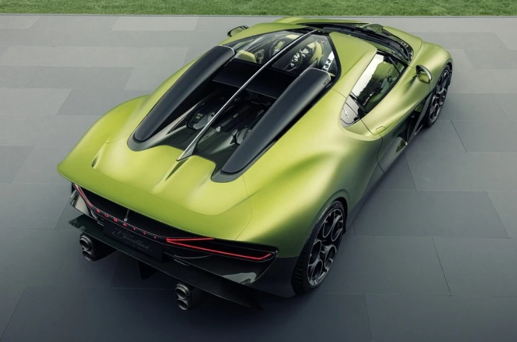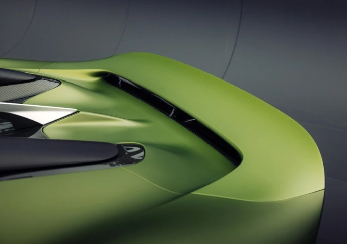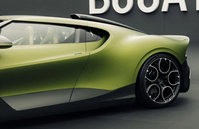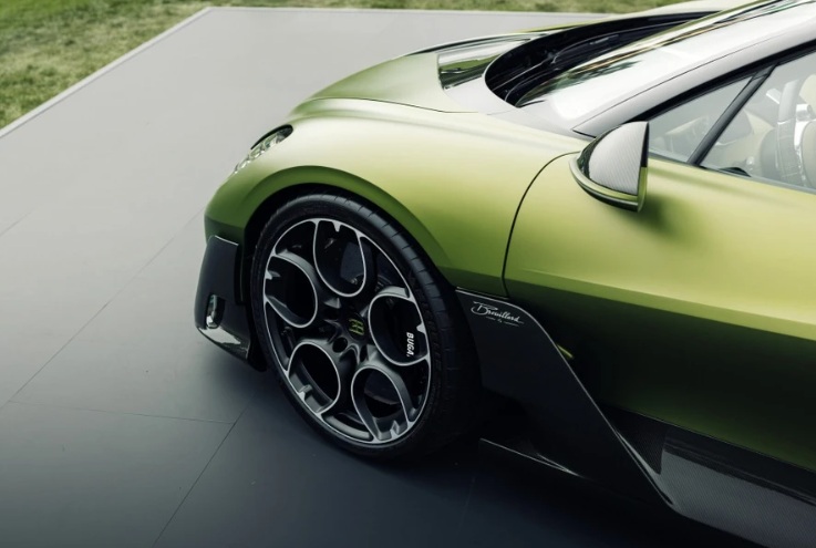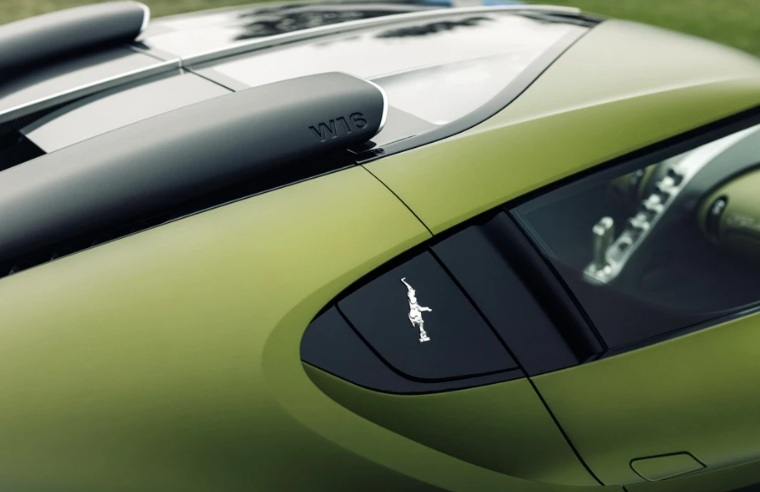 Thân xe được phủ một lớp sơn xanh nhám kết hợp các mảng tối màu ở phần dưới, tạo vẻ khỏe khoắn. Điểm nhấn khác biệt là cánh gió cố định kiểu “ducktail”, gợi nhớ đến mẫu Chiron Profilée độc đáo.