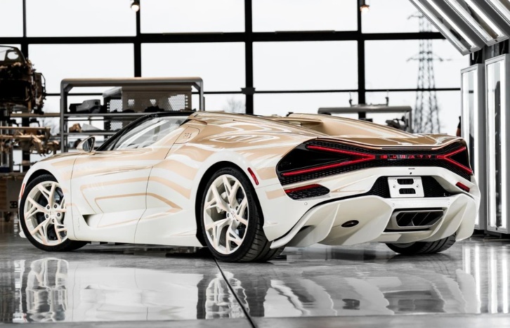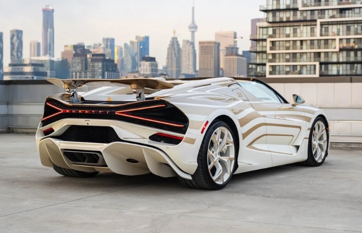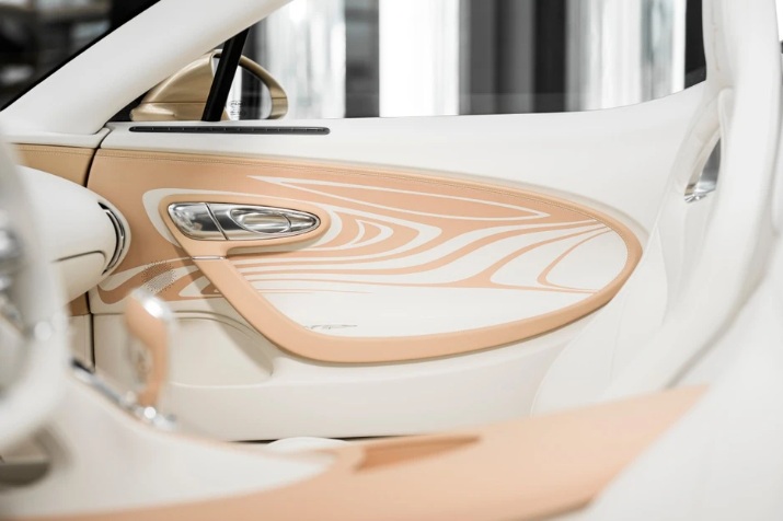 Điểm nhấn thu hút mọi ánh nhìn của Bugatti W16 Mistral La Perle Rare chính là phối màu trắng Ghost White kết hợp cùng vàng cát Dune. Các nghệ nhân tại Bugatti đã sử dụng họa tiết “Vagues de Lumière” để mô phỏng hiệu ứng thị giác của ánh sáng phản chiếu trên bề mặt sơn, tạo nên một diện mạo sống động như đang chuyển động ngay cả khi xe đứng yên.