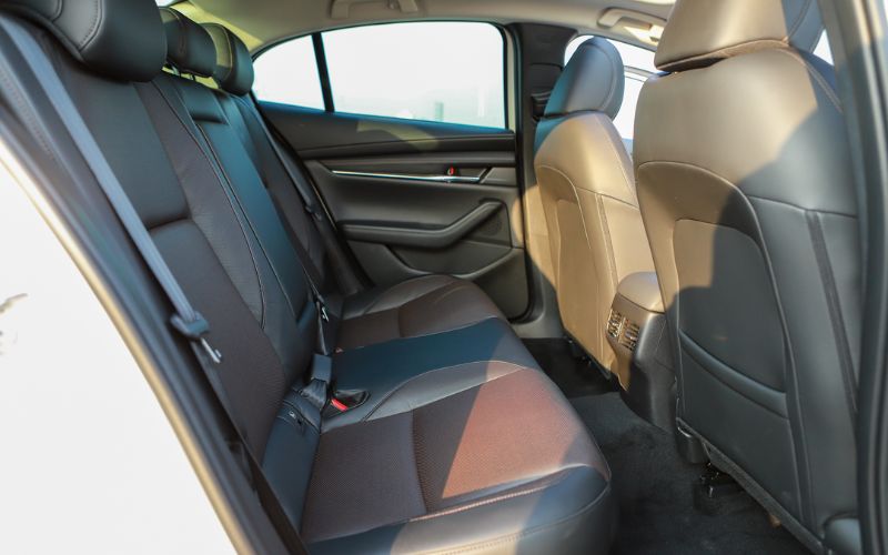 Hệ thống ghế ngồi được bọc da cao cấp (trừ bản Deluxe), ghế lái chỉnh điện được tích hợp chức năng nhớ 2 vị trí, ghế phụ trên Mazda 3 2024 vẫn chỉnh cơ. Ở bản sedan, hàng ghế thứ 2 tương đối rộng rãi, tuy nhiên những hành khách cao to sẽ có chút không thoải mái bởi mui xe thuôn dài buộc người dùng phải đánh đổi không gian ở đây. Dù chiều cao đã được hạ thấp nhưng trần xe vẫn khá thoáng, lưng ghế có độ ngả lưng tốt giúp hành khách cảm thấy thoải mái khi đi xa.