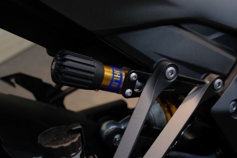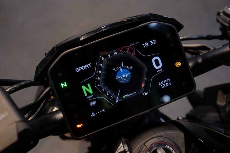 Khả năng kìm hãm sức mạnh của xe được đảm nhiệm bởi hệ thống phanh Brembo M4.32 Monobloc đi kèm đĩa đôi 310 mm ở bánh trước. Bên cạnh đó, bảng đồng hồ trung tâm đã được nâng cấp lên màn hình màu TFT 5 inch, hỗ trợ kết nối điện thoại thông minh qua ứng dụng Rideology. Tính năng này giúp chủ xe quản lý dữ liệu vận hành, lịch bảo trì và tùy biến các cài đặt cá nhân ngay trên thiết bị di động.