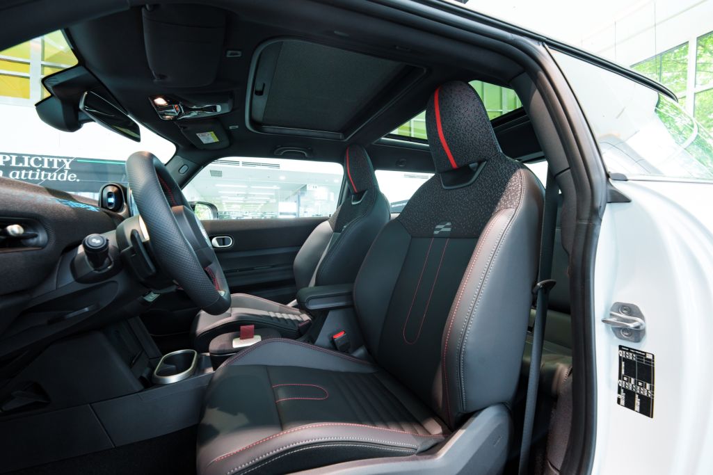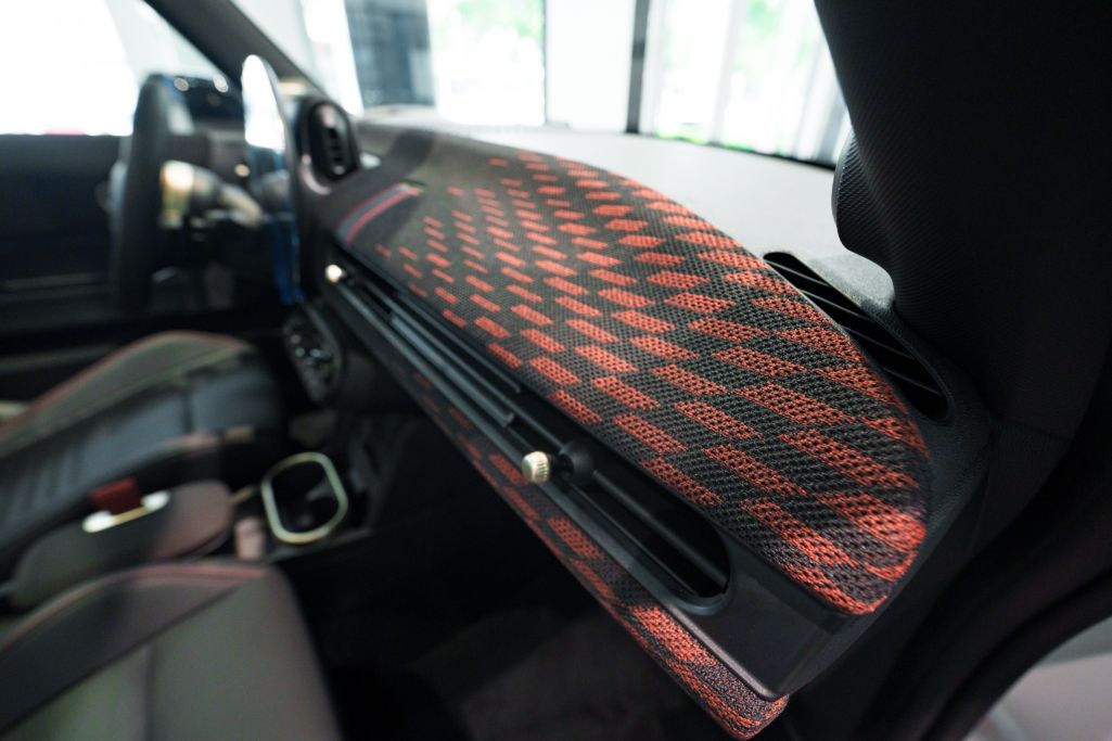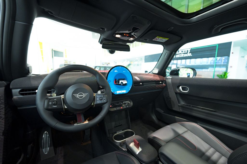 Khoang nội thất của JCW vẫn giữ thiết kế tương tự bản tiêu chuẩn, nhưng được bổ sung nhiều chi tiết hướng đến trải nghiệm lái thể thao. Trung tâm bảng táp-lô là màn hình OLED 9,3 inch, có thể thay đổi giao diện tùy theo các chế độ lái như Go-Kart, Green hay Personal. Mini cũng kết hợp chất liệu da và vải dệt kim polyester để tạo điểm nhấn cho táp-lô, thành cửa và bệ tỳ tay.