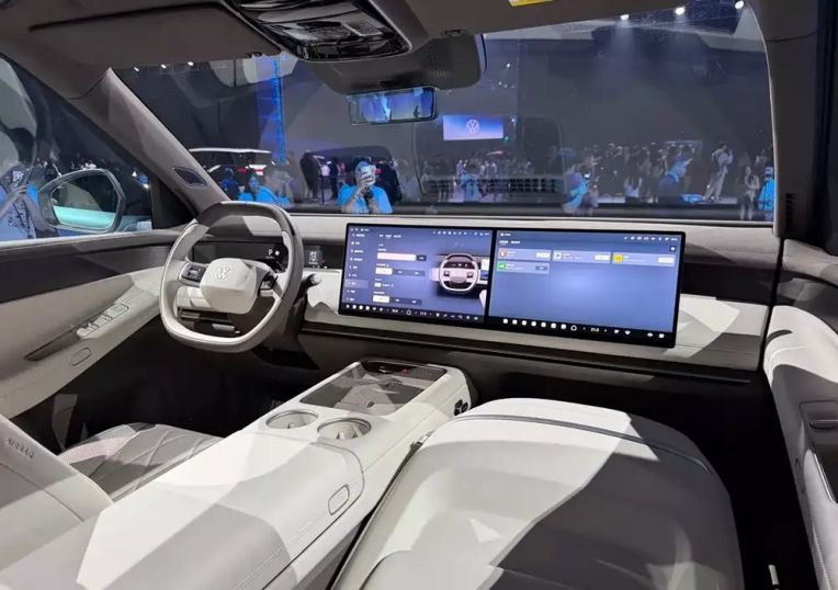 Bên trong khoang cabin, ID. Era 9X được bố trí 6 ghế ngồi theo cấu hình 2+2+2. Điểm nhấn công nghệ nằm ở khu vực táp-lô với cặp màn hình 15,6 inch kết hợp cùng bảng đồng hồ kỹ thuật số và màn hình hiển thị kính lái HUD. Đặc biệt, hàng ghế thứ hai được trang bị công nghệ “màn hình ma thuật” Smart Surface ẩn dưới tấm ốp gỗ táp-pi cửa, chỉ hiển thị khi kích hoạt nhờ kỹ thuật đục lỗ laser siêu nhỏ. Hệ thống này còn hỗ trợ cảnh báo điểm mù khi hành khách mở cửa xe.