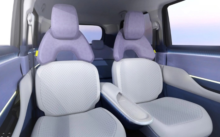 Bên trong, Vision e-Sky gây ấn tượng với khoang nội thất hai tông màu tím – trắng, tạo cảm giác hiện đại và nhẹ nhàng. Thiết kế tối giản, hầu như không còn nút bấm vật lý, phù hợp xu hướng xe điện đương đại. Bảng táp-lô được tạo hình dạng cánh cung, giúp không gian phía trước trở nên thoáng và liền mạch hơn, đi kèm hệ thống đèn viền nội thất tinh tế.